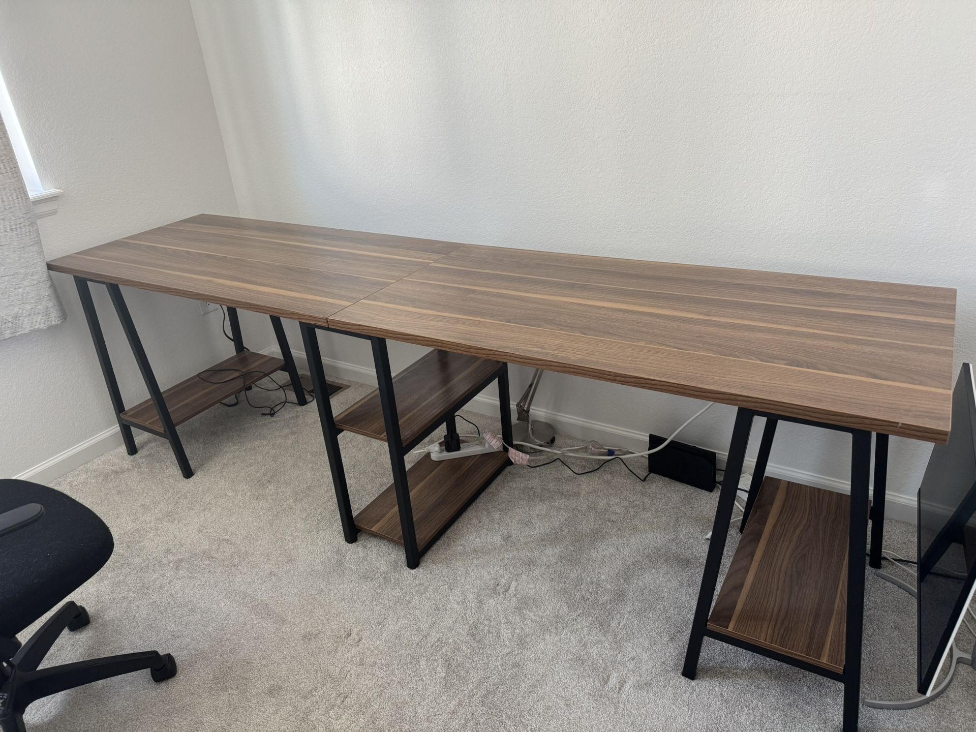 It’s a double desk! Only damage sustained is included in pictures. Unfortunately cannot stand separated and only functions as a double. Philips-head screwdriver required for assembly. Dimensions: Length 7’ 10.5” or 94.5inches Width/depth 23.5inches Height 29”