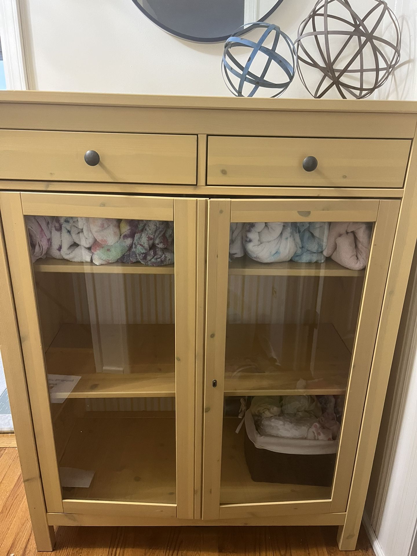 Yellow wood armoire. Three shelves and two glass doors. Amazing addition for an accent piece and touch of color.