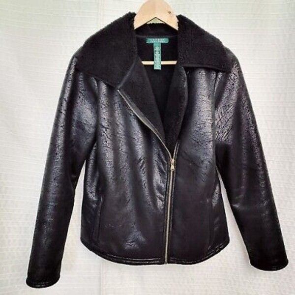 NEW Ralph Lauren Black Leather Moto Coat Sherpa Fleece Lining Jacket PXS Petite