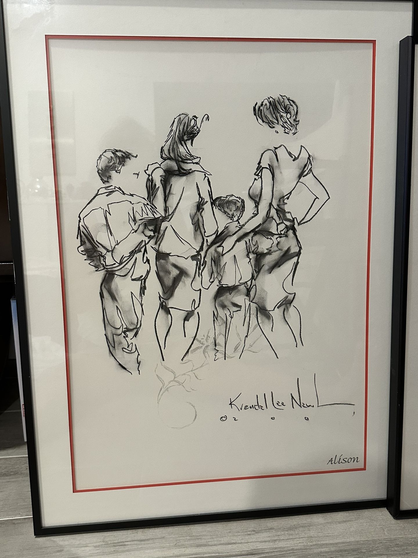 The butt artist, Charcoal sketch of four, signed by Krandel Lee Newton, 2001 framed