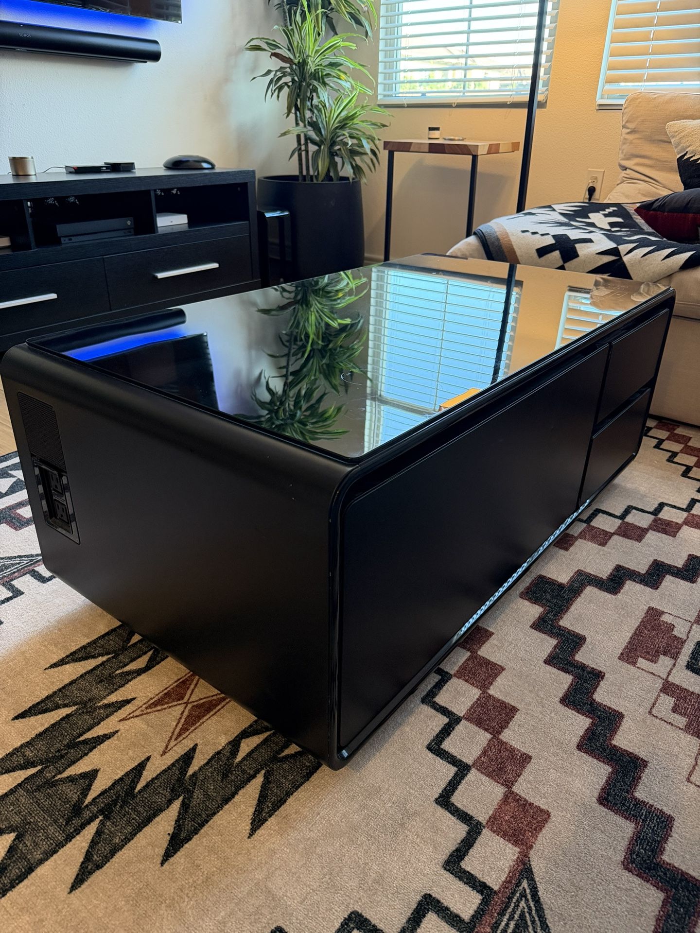 Letting go of my Sobro smart coffee table. It has been used in my living room and everything still works as it should — the cooler drawer keeps drinks cold, the Bluetooth speakers pair up instantly, LED lighting works, and all the charging ports are functional. There are a few minor scuffs and signs of normal use on the tempered glass top but nothing major. It’s heavy, so bring a friend to help load it. Local pickup only.