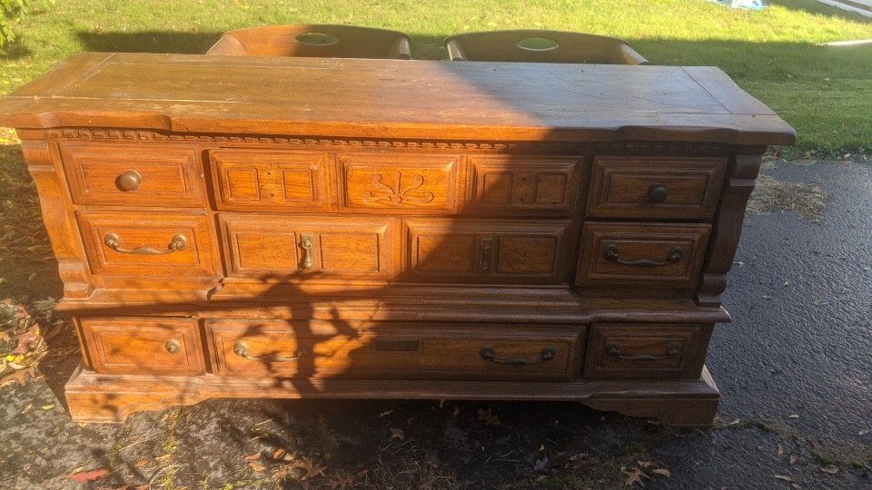 Dresser mirror 2 night stands and queen bed. Needs some TLC but solid and sturdy