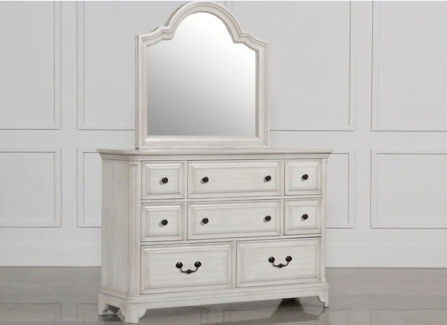Dresser - 62" W x 18" D x 42" H Mirror - 40" W x 2" D x 39" H Set. - 62" W x 18" D x 81" H Dresser is in great condition. Unfortunately there is little room in the apartment and we have to sell it. Regular price is $1197.66 at Living Spaces, you’ll be saving $500 on this dresser