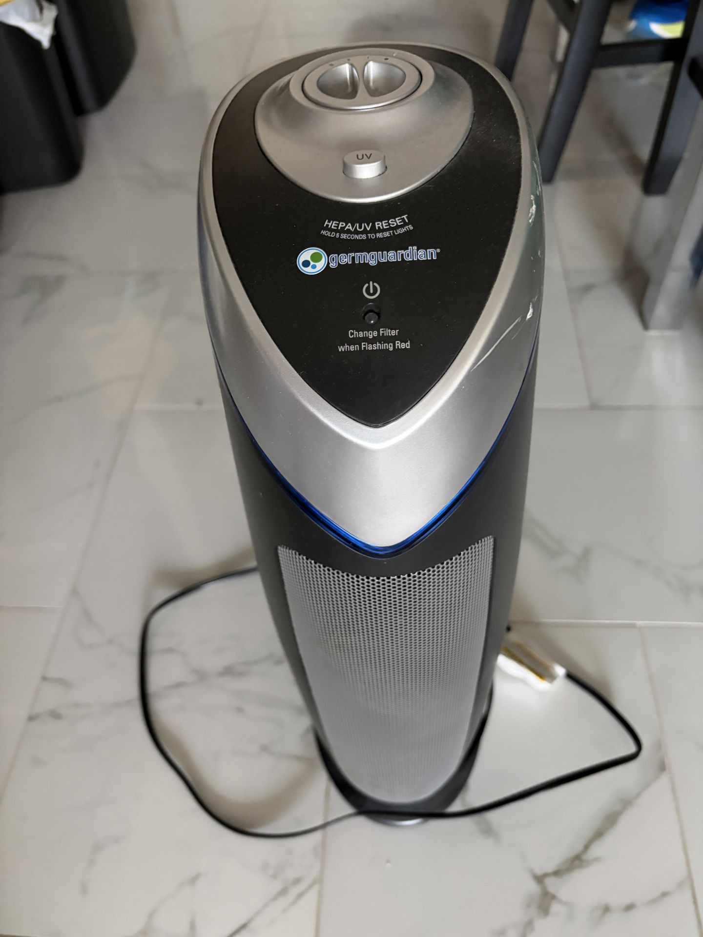 Germ Guardian Air Purifier with HEPA Filter and UVC Black: Germicidal UV, Carbon Filter, 3 Settings, 500-800 sq. ft. Coverage. Only selling due to downsizing, still in working condition. Slight scuff on side of top as shown. Includes current filter. Pickup is in Reseda, cash only.