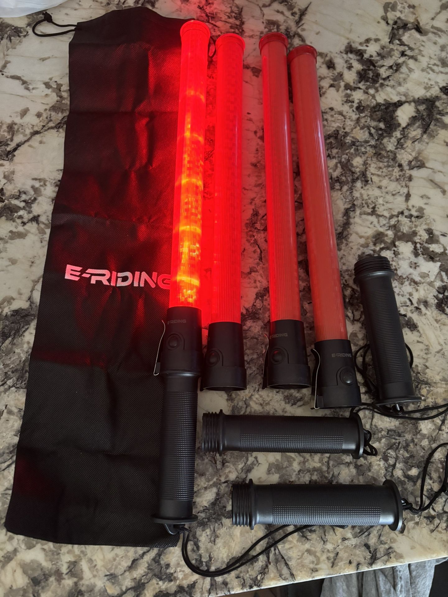 -Traffic Safety Baton For Airport, Parking, Car -Price includes 8 brand new energizer batteries (each wand needs 2) GOOD VISIBLE- The long lighted portion provides great visibility. And you can use the red traffic wand in all types of weather from heavy fog to pouring down rain. LIGHTWEIGHT & DURABLE- The traffic wand is made of PVC material, it's so light that your arms won't be sore even after long time use, and it's very bright at night. 3 FLASHING MODES - Each traffic safety baton has 3 flashing modes: fast flashing & slow flashing & steady-glow. You could use light fast flashing and slow flashing in emergency situations or use light steady-glow mode when commanding traffic. WIDE USE-The hand-held traffic wand LED light stick is very versatile, you can use it as a signal flashlight for traffic controls, parking attendants, construction crews, etc. SIZE DETAIL- There are 4 pieces hanging warning batons in each package. The size of the light stick is 21*1.4 inch, the net weight is 0.33 pounds for each(Using 2 C-size batteries which is not included). Water-resistant IPX-4 and with a metal side clip to clip on the pocket so don't have to hold it in hand.