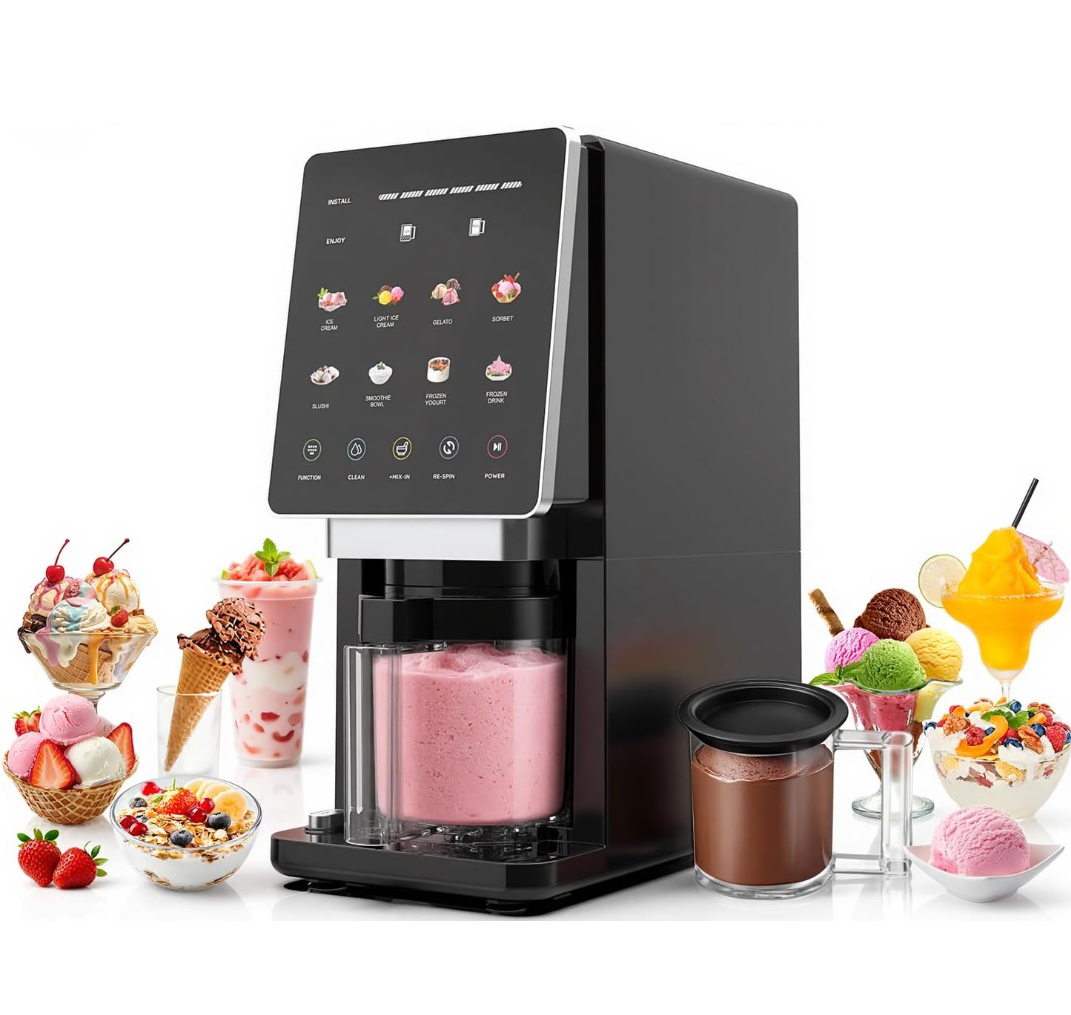 Brand New in Box $125+ on Amazon 10-in-1 Ice Cream Maker (Ice Cream/Gelato/Sorbet/Slushie): From creamy ice cream for family movie nights to refreshing sorbets after workouts, enjoy gelato, smoothie bowls, slushies, milkshakes, light ice cream, mix-ins, and more. Bring café-style frozen treats to your kitchen with a compact design made for everyday creativity. Mix-In Customization (Flavor Add-Ins + Ideas): Personalize every batch with the dedicated Mix-In mode—blend nuts, chocolates, cookie pieces, or fruits directly into your frozen base. Popular mix-in ideas: cookie + chocolate chips, strawberry + white chocolate, banana + nuts, brownie + chocolate pieces. Re-Spin Function (Creamier Texture): Customize your perfect texture with a single press. After the initial cycle, the Re-Spin function adds an extra churn that helps transform your treat into a smoother, creamier, more indulgent frozen dessert—dial in the finish exactly the way you like it. No Ice / No Liquid Nitrogen—Freeze Your Base in Advance: No ice or liquid nitrogen required. Simply prep your ingredients in the 20 oz (1) pint and freeze in your home freezer before spinning—follow the included instructions/recipes for best results (prep steps vary by recipe).