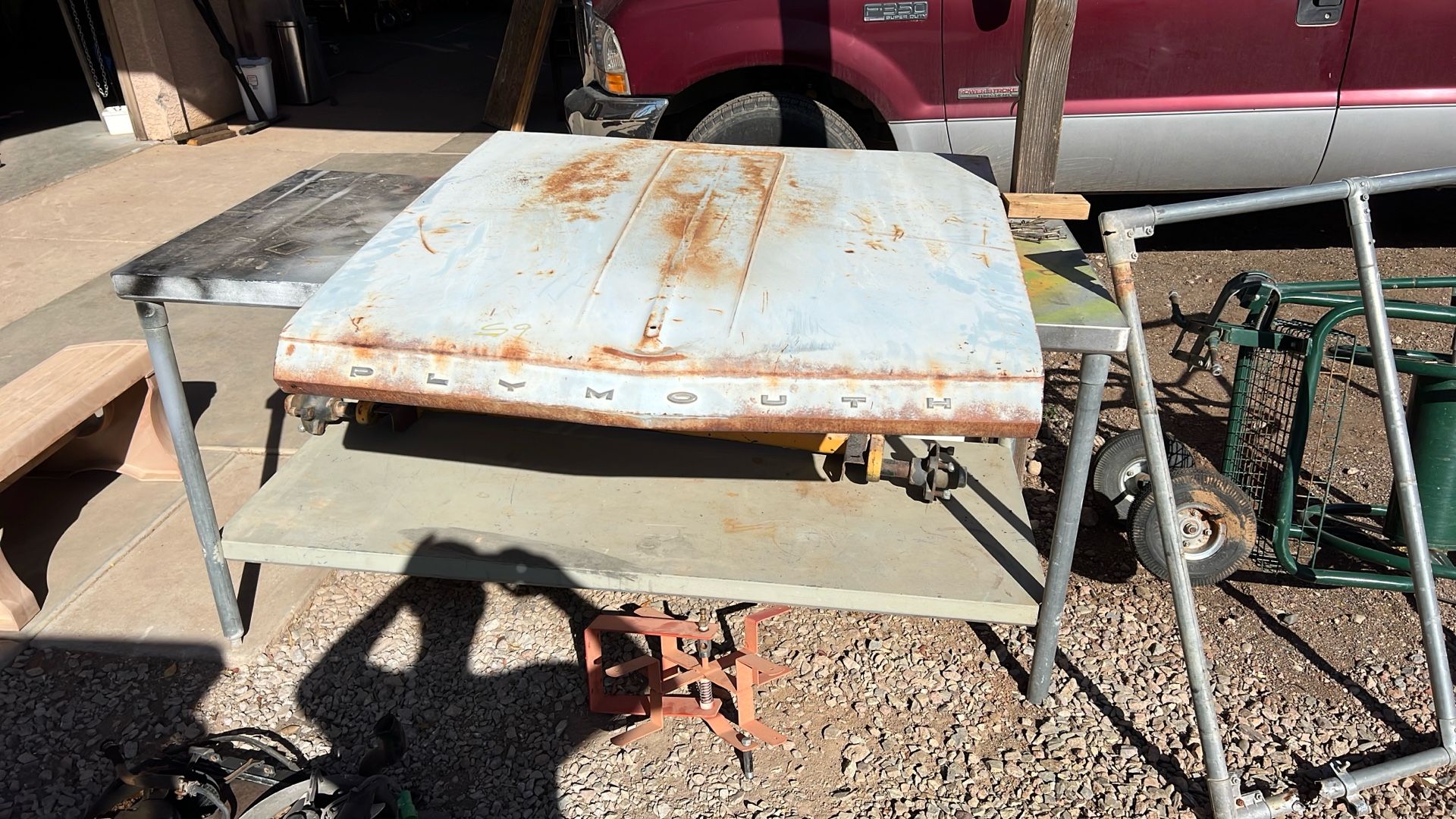 Hoodfor a 1963 and a 1964 Plymouth. This hood is a usable but needs some repair.