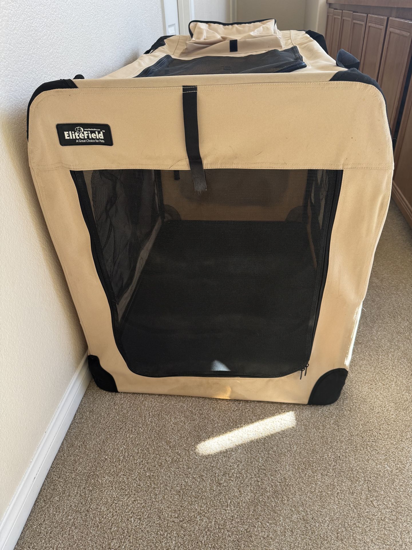 Soft crate. Collapsible. In good condition. Asking $75, these run $120 new. Comes with carrying case. 42in L x 28xW x 32H.