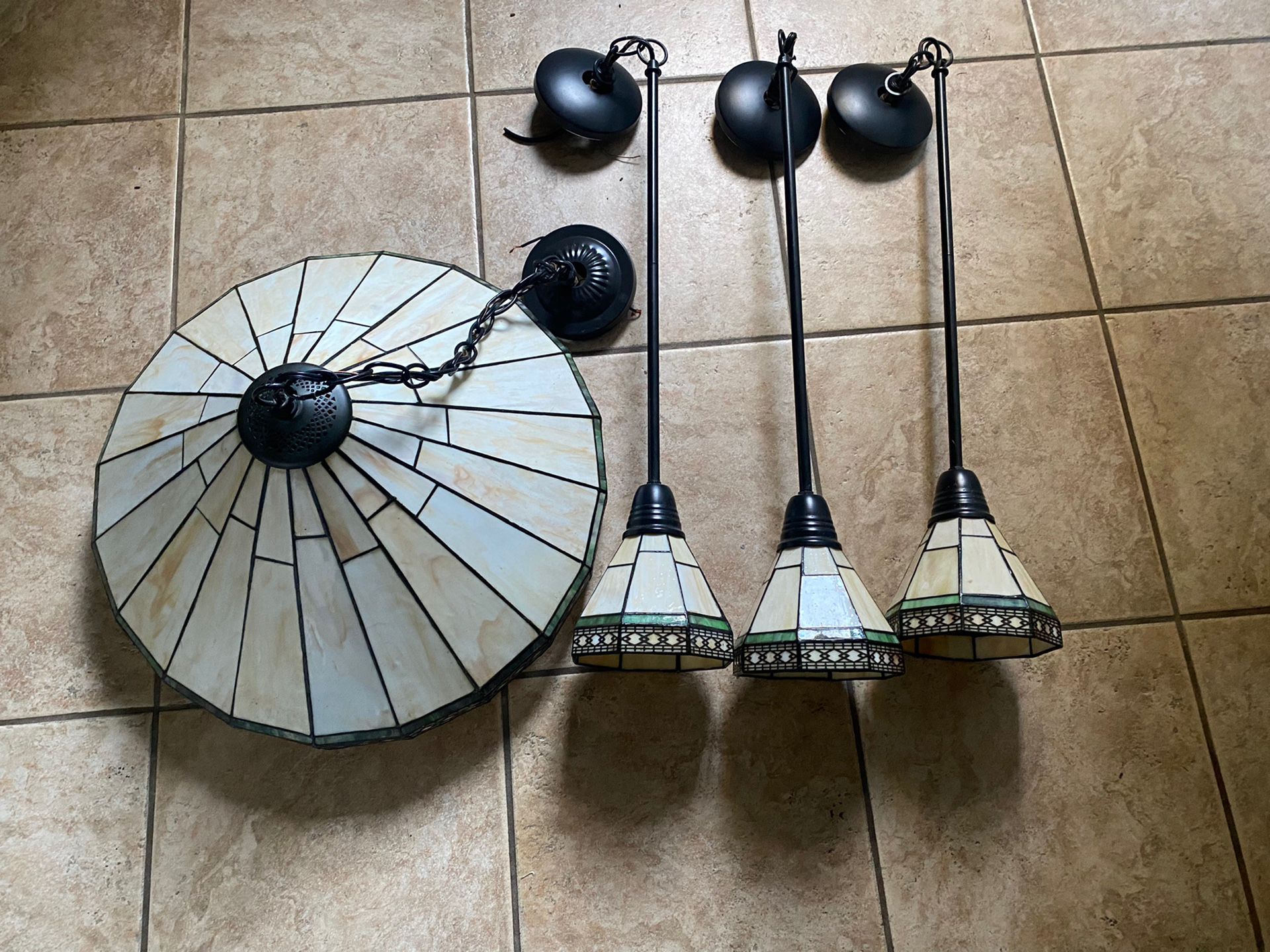 Great looking Tiffany style chandelier. Made of hard plastic. Chandelier measures 19” wide . Comes with 3 hanging pendants that measure 26 1/2” long . Tha shades are 5 1/4” high bottom is 5 1/2” wide and top has a 2” diameter. Model 20070-936pf. The wires were cut so not sure if it will need rewiring .