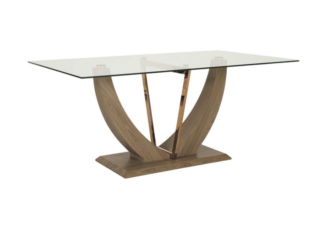 β’ Bring a unique, contemporary look with a touch of glam to your dining experience with the Oslo Glass Top Dining Table from the Oslo Dining Occasionals Collection by Yongsheng Furniture. β’ Contemporary glass top table features a 40X68 rectangle 10mm tempered glass with an elegant designed base in a simulated wood grain finish accented with rose gold metal support braces β’ Retails for $450+ β Brand new in the box. (2 VERY LARGE, HEAVY BOXES; Please bring 2 or maybe 3 or maybe 4 people to carry!!) π