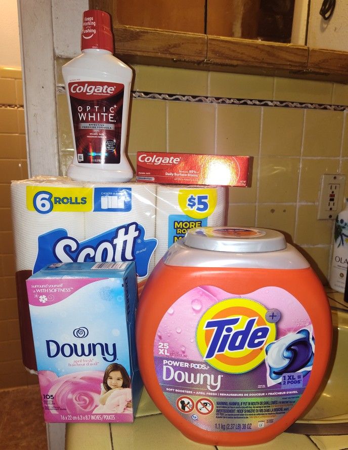 Paper Towels Scott Optic white toothpaste Optic white mouthwash Downy Sheets XL Tide pods Downy
