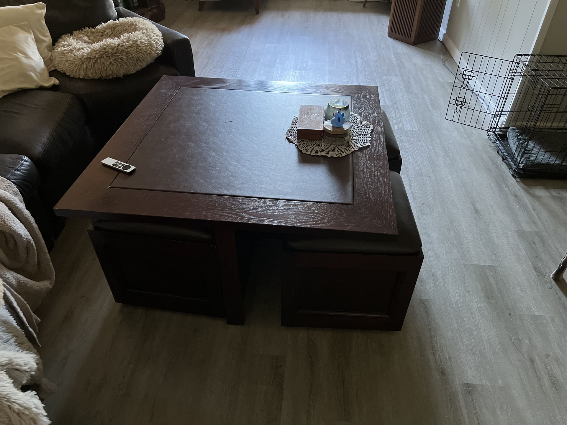 Living room table with 4 rolling stools (with cushions) that store underneath. One stool has a broken wheel otherwise in good condition. Table: 42"x42"x22" Originally $800 new