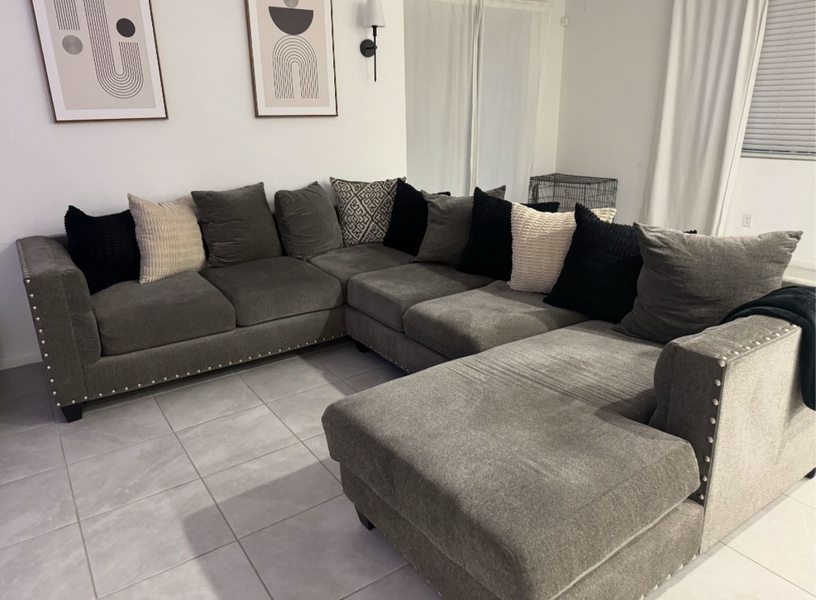 Only had for 6 months bought it for $2,200, switching up colors in my living room, no kids, and dogs allowed on it, super clean not stained or broken. I have original pillow covers as well (grey with swirls). Will deliver for a small fee.