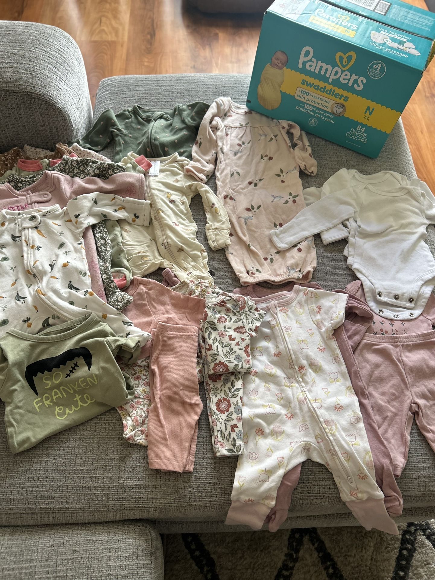 Newborn clothes only wore once before our baby outgrew them. Throwing in a box of diapers, unused Johnson and Johnson’s wash, and a feeding pillow.