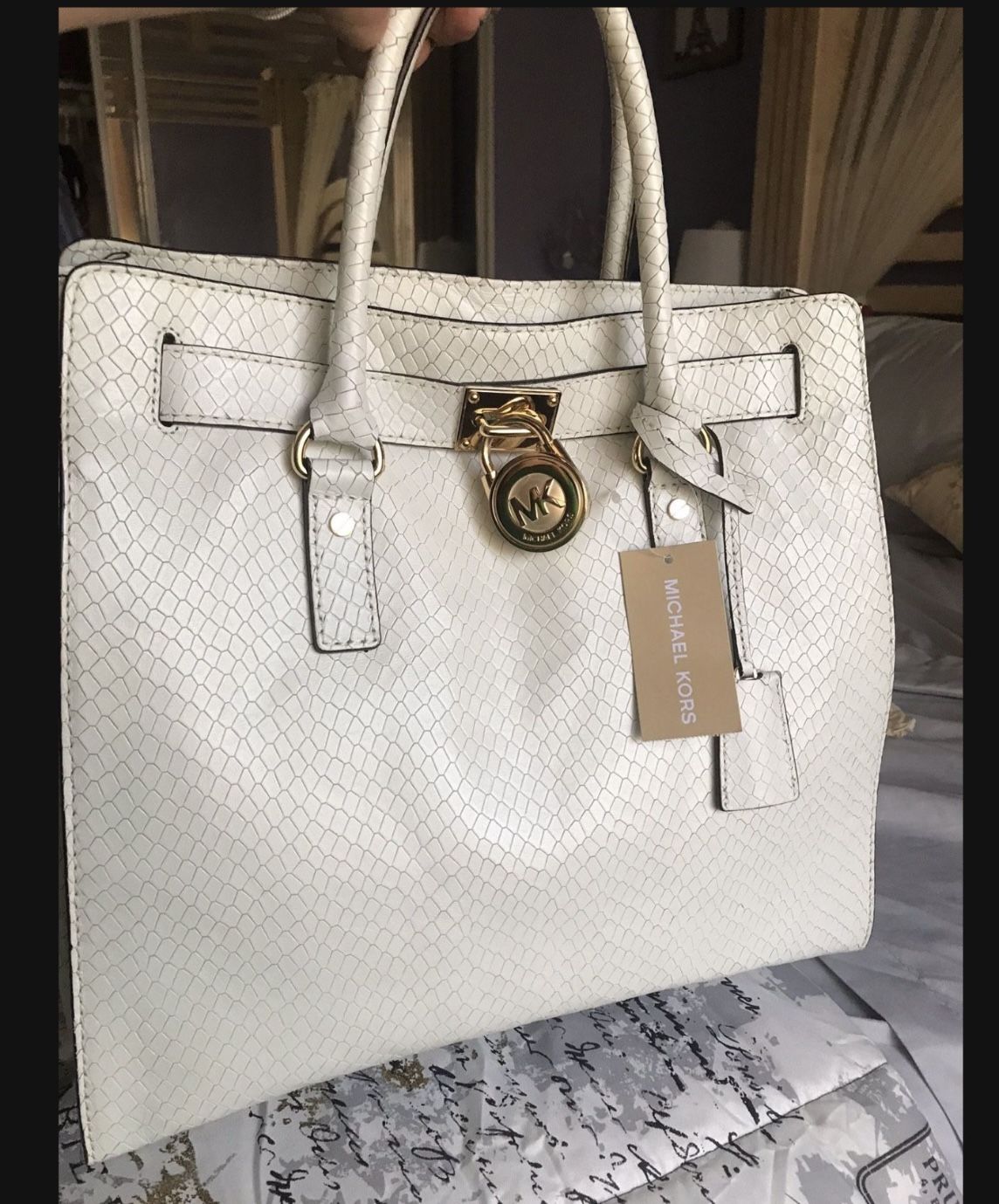 ONLY SERIOUS BUYERS PLEASE Brand New Authentic Michael Kors Limited Edition White Embossed Optic Python Leather,Shoulder Strap drop down length is 11” ,has Gold padlock and key Measu..12.5”X5”X14.25” Retail price $489 plus tax My Price $280🎈 NEW Summer Beach Tote $25 🎈 Recoger en Rialto Pickup Before 5 pm Mira mi página more Offers para