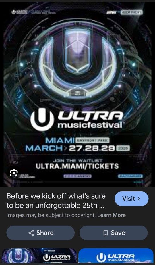 I am selling 4 tickets to ULTRA MUSIC FESTIVAL in Miami March 27,28,29. The tickets are 3 days general admission tickets. My plans are changed and I can't attend to the event. Prices are much higher now and all I need to get my money back. Wristbands are going to be sent out shortly from the promoter so you will have to get them on time and activate them as well. Pick up in Rolling Meadows IL.