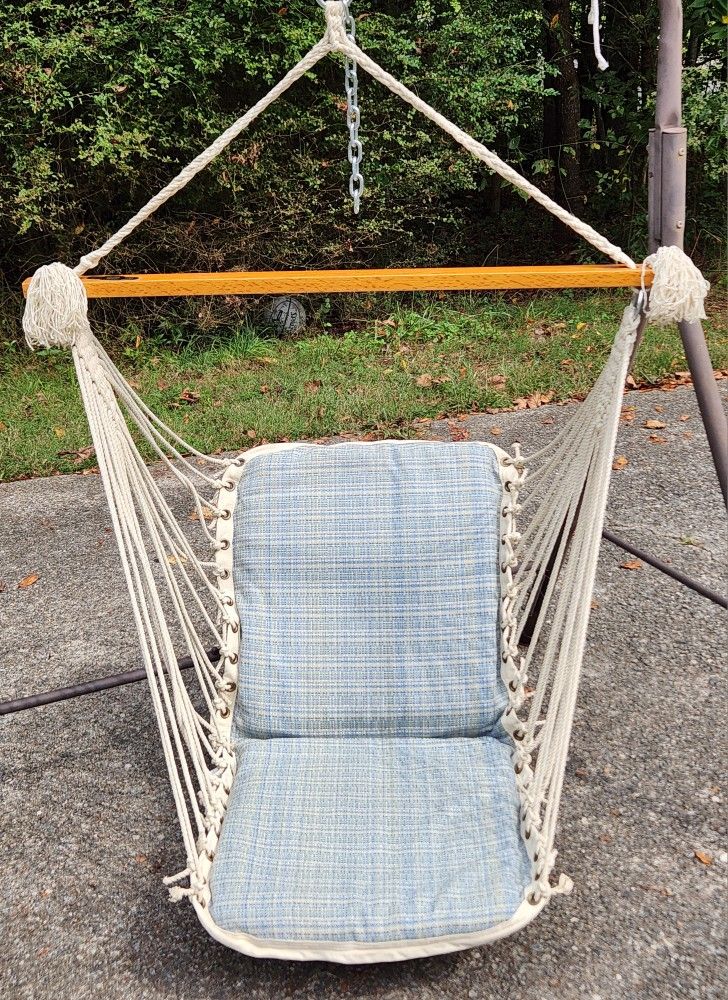 This Pawley's Island single cushioned swing is a comfortable and stylish addition to your backyard or outdoor space. It is made from high-quality materials (Sunbrella and Duracord materials), including durable ropes, sturdy insect and rot resistant wooden spreader bar frame, and soft cushions. It is excellent for both children and adults, providing a relaxing and enjoyable way to spend time outdoors. Read your favorite book in it, perhaps? It can be hung from a variety of surfaces, including trees, porch beams, or swing sets. *Delivery Available