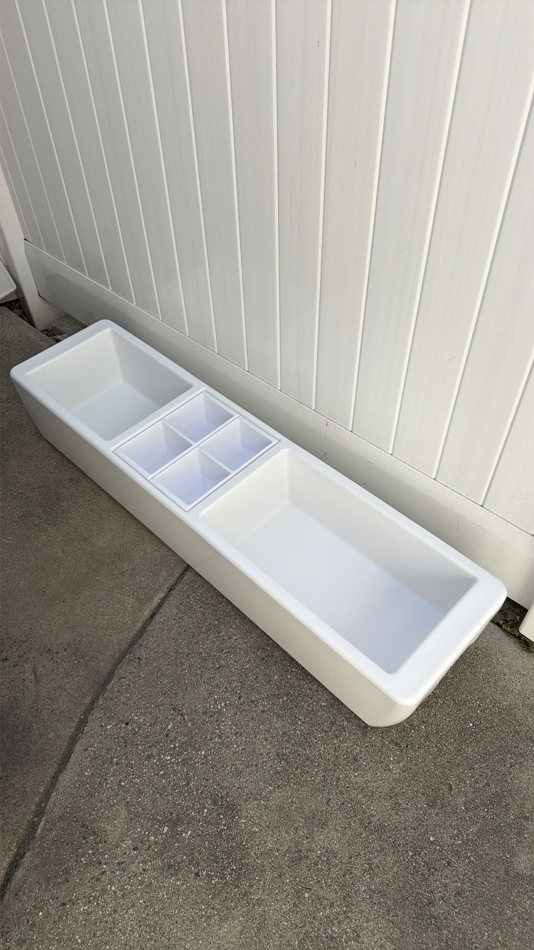 The REVO Party Barge is the ultimate solution for your party beverage spread, featuring premium insulation and three compartments for a versatile all-in-one bar station display. Three individually insulated compartments for versatile display options. Complete bar station with condiment trays, with each compartment doubling as a spacious ice bucket. Generous 44” length provides easy access for guests. Convenient hand grips ensure effortless mobility. Specifications: 44” x 11” x 7.5”h, weighing 15 lbs. Holds up to 39 bottles/cans or 19 bottles of wine. Includes two dishwasher-safe condiment trays and an aluminum ice scoop (hand wash only). Used only 2-3 times. Like new https://offerup.com/redirect/?o=aHR0cHM6Ly9yZXZvY29vbGVycy5jb20vY29sbGVjdGlvbnMvY29vbGVycy9wcm9kdWN0cy9iZXZlcmFnZS10dWItaWNlLWJ1Y2tldC13aGl0ZQ==