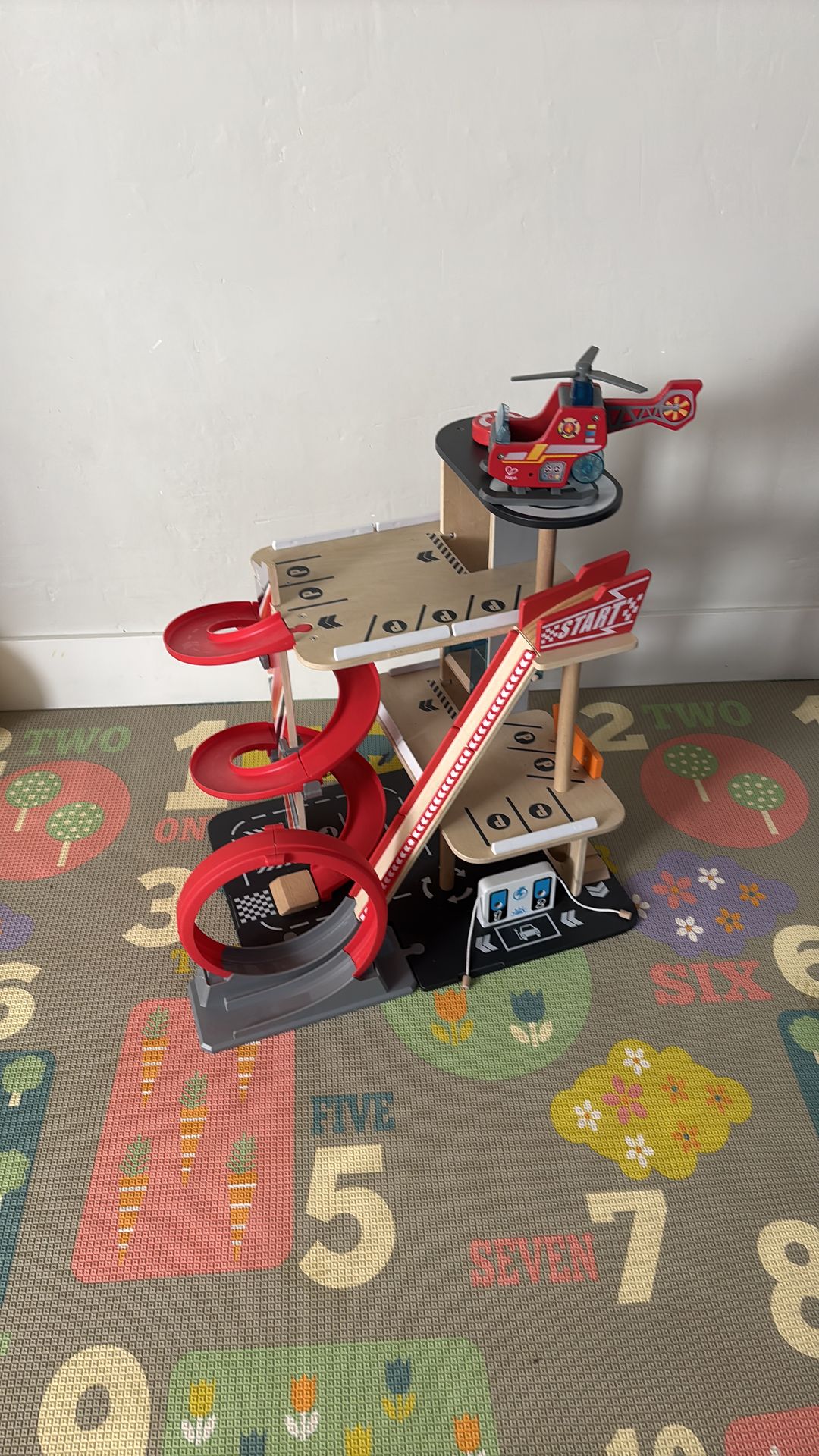 ***does not come with wooden cars*** In excellent condition! •Suitable for 3Y & above •This three-level high-rise parking lot comes with a variety of creative functions and racing action for hours of play. •This luxury parking garage comes with a boxcar elevator! Place your cars in the lift and turn the knob to get them to the upper levels or back down again -if they don't feel like going down the incredible ramps The garage comes equipped with two stunt tracks. Send your toy vehicles whizzing down the spiral ramp for a high-speed race to the bottom, or defy gravity with a 360°loop track that can be transformed into a launch ramp! •This garage playset is made of quality wood construction and finished with non-toxic details, making it safe and sturdy enough to last many years