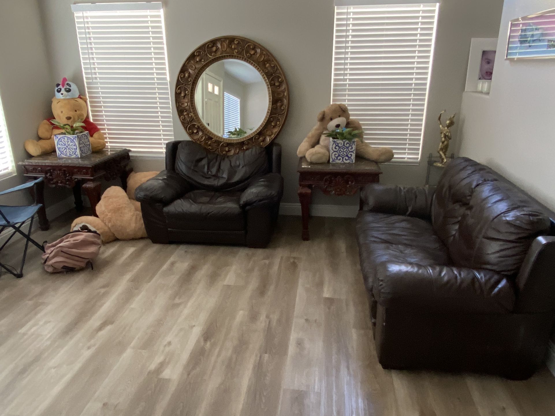 Two leather sofas for sale for $200 to end tables for sale for $200 one round mirror for sale 125 dollars