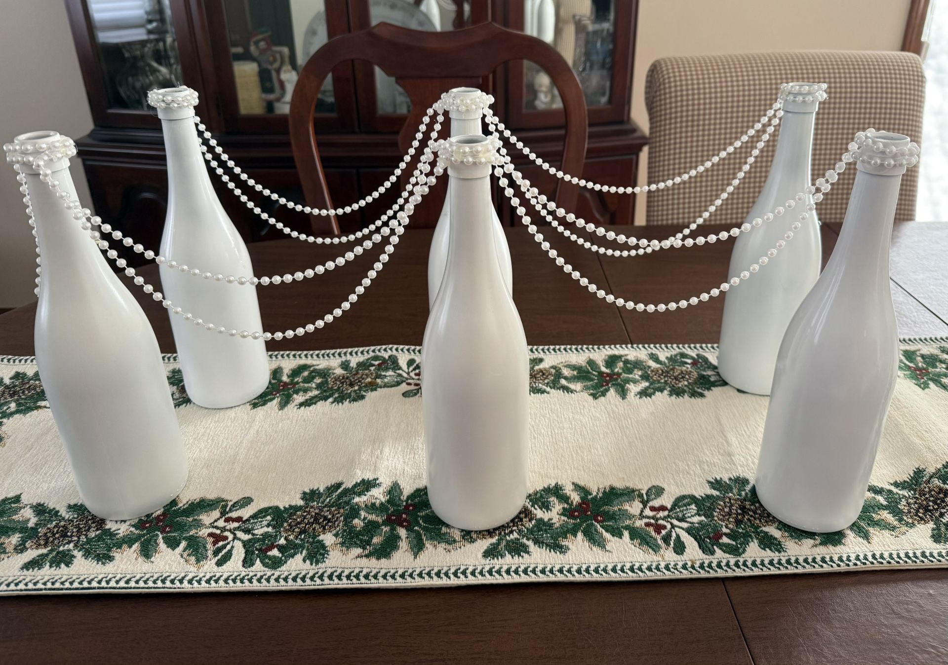 Wedding shower decorations Individual Set if 3- $10 Four Sets of 3-$35 Individual beaded bottles- $6 each Solid white bottles- $3 each