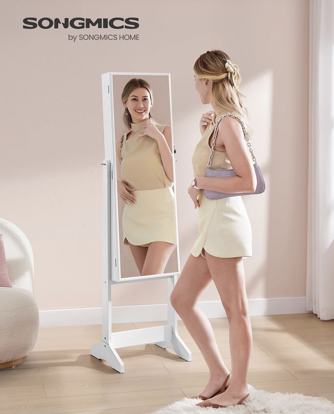 New in box Mirror Jewelry Cabinet Armoire, Standing Full-Length Mirror, Lockable Jewelry Organizer, Gift Idea, White Surface and Black Lining UJJC69WT