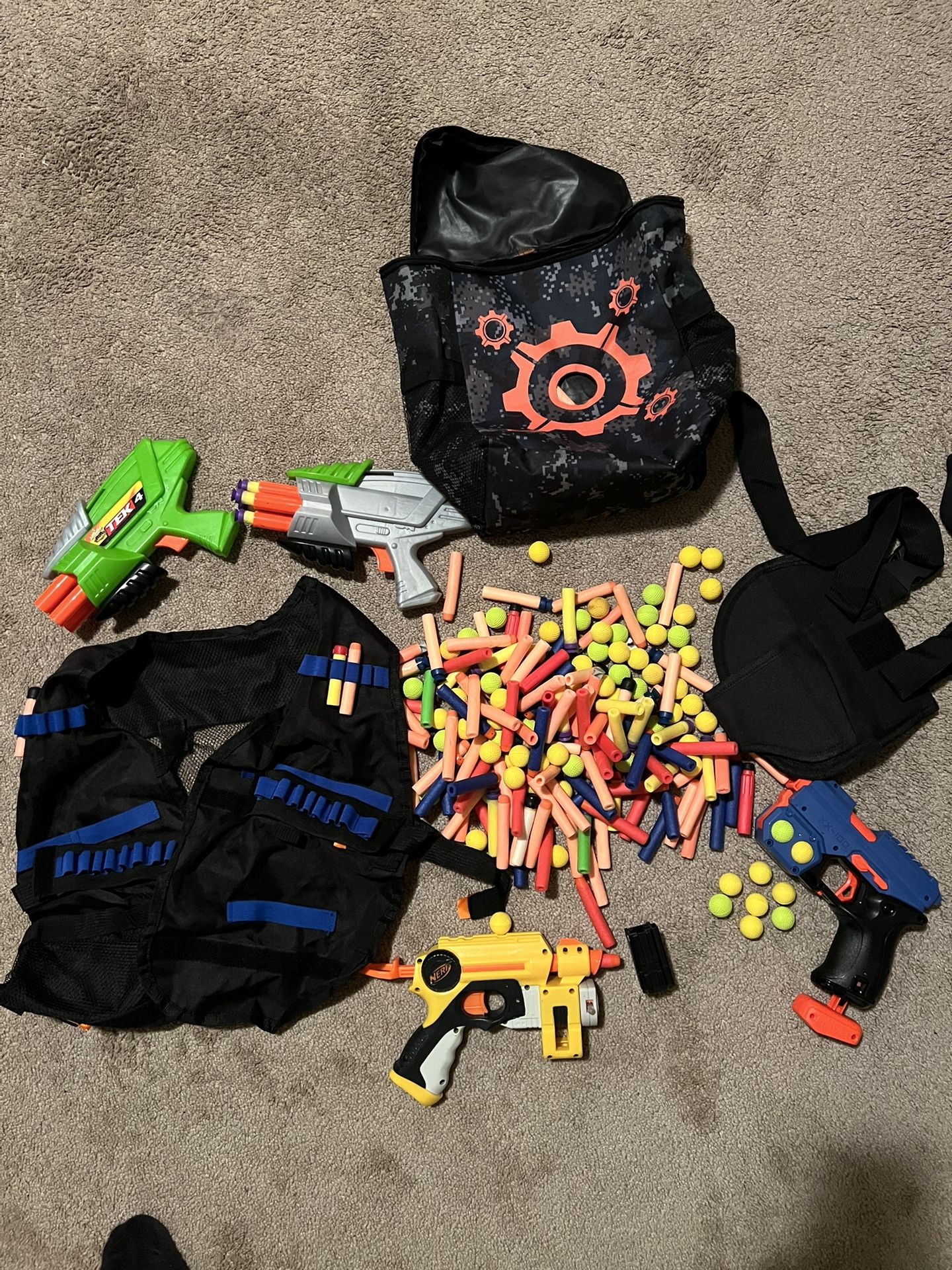 (4) Nerf Guns With Ammo, Vest, Holster, Target Bag Which Also Stores Equipment. Used and in good condition. Retails easily over $100.