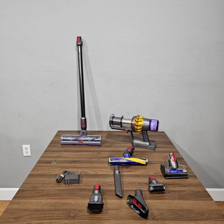 this v15 detect runs strong and has been gone through top to bottom. set price $400 bin, cyclones, filters, and motorbar were all cleaned and checked. upgraded with the full-size outsize xl cleaner head for wider coverage and stronger pickup on carpet and hard floors. easy-empty bin design, lcd screen shows runtime and modes (eco / auto / boost). quick-connect wand and removable battery give around 60 minutes per charge. washable hepa filter setup, no loss of suction. comes with: • v15 detect main vacuum body • upgraded outsize xl power head • crevice and dust attachments • charger • wand and mount price is firm. runs excellent, everything works like it should.