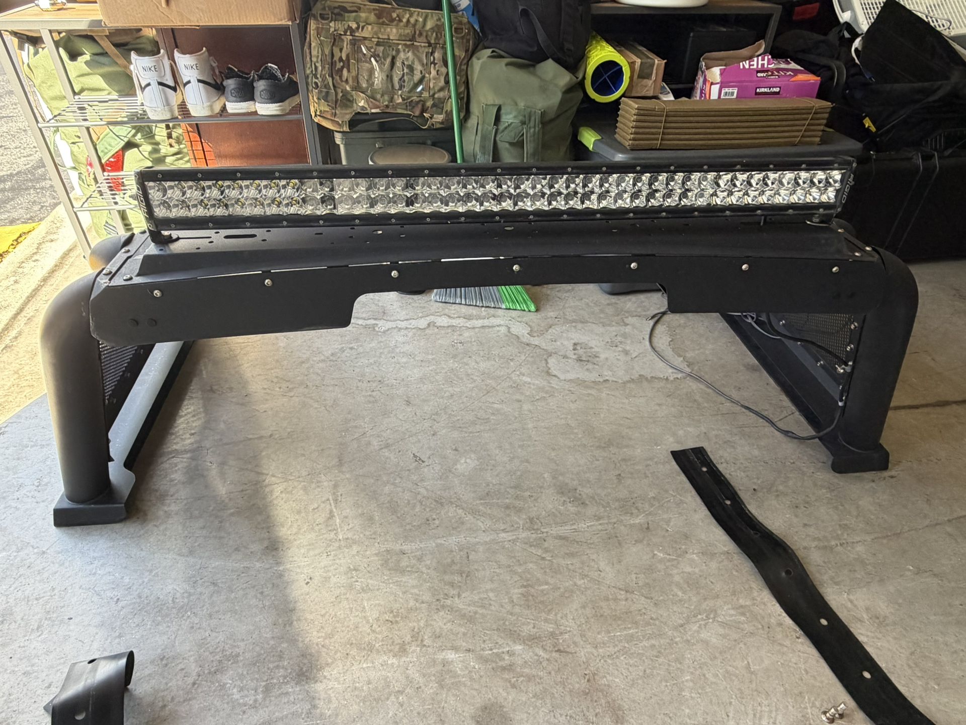 CASH ONLY For a Ram 1500, only a couple years old and in great condition. All parts and bolts included. Can be installed on any full size and mid size pickup truck bed. Mounted on top is a RIGID straight light bar, which works perfectly. All wires are attached and it has had no issues. There are a couple rust spots from normal wear, but it’s in great condition. Have to sell it because the dog crate doesn’t fit with it on unfortunately. Retails for $2600 new