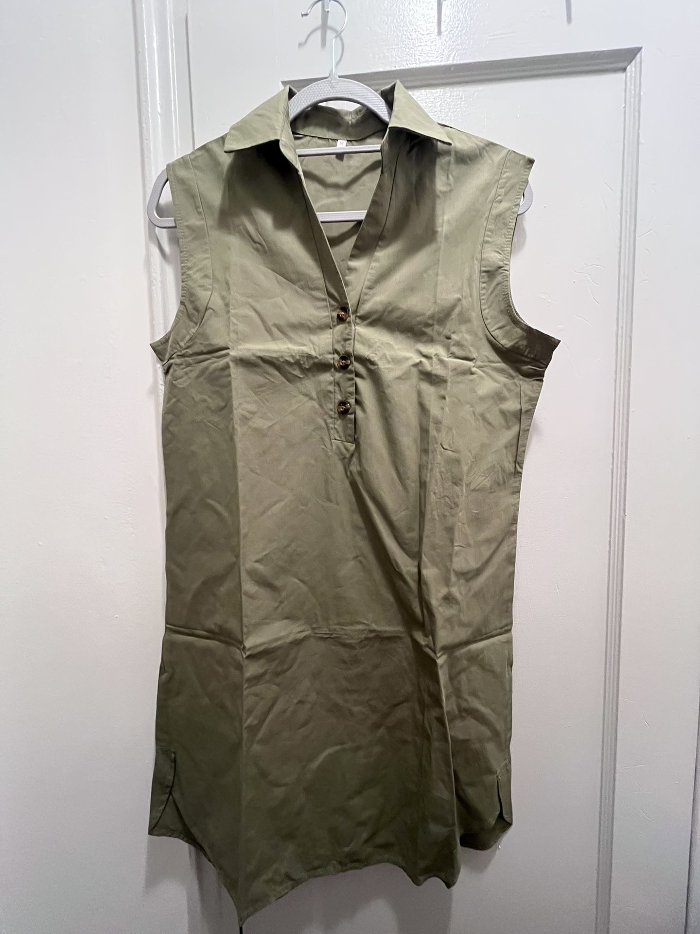 This item was purchased on Temu. Never worn. Army green shirt dress with three buttons on the front. Runs big, fits loose & airy. I ordered a medium as I’m 145lbs but could’ve possibly gotten a XS. That’s how long & big it runs. Nice color. Wrinkled as it was taken out of the original packaging.