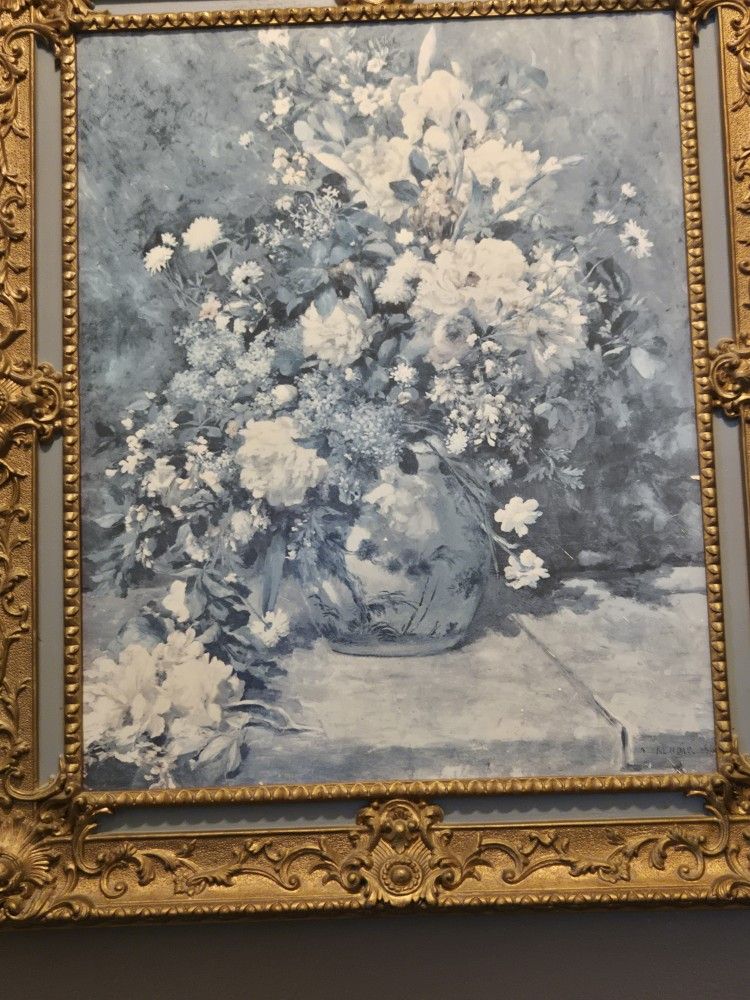 This is a large vintage Renoir print of florals in blue. It is framed in gold with no glass.