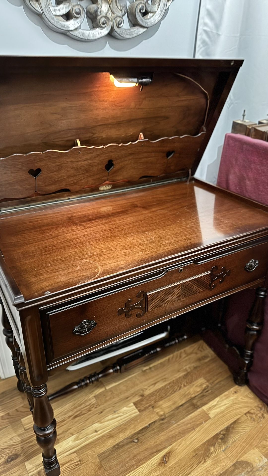 If you are reading this item is available will remove once item is purchased. Vintage Writers Secretary Desk Key Features: Drop-Front: The top writing surface drops down to reveal interior storage compartments, which currently hold paper. Heart Cutouts: The internal pigeonhole organizer features decorative heart-shaped cutouts, a design element sometimes associated with the Arts & Crafts movement or specific manufacturers like Fred Macey Co.. Leg Style: It features highly turned or "spool" legs, which are a characteristic of Victorian-era furniture. Hardware: The drawer below the main compartment has carved wooden escutcheons and ornate metal pulls.