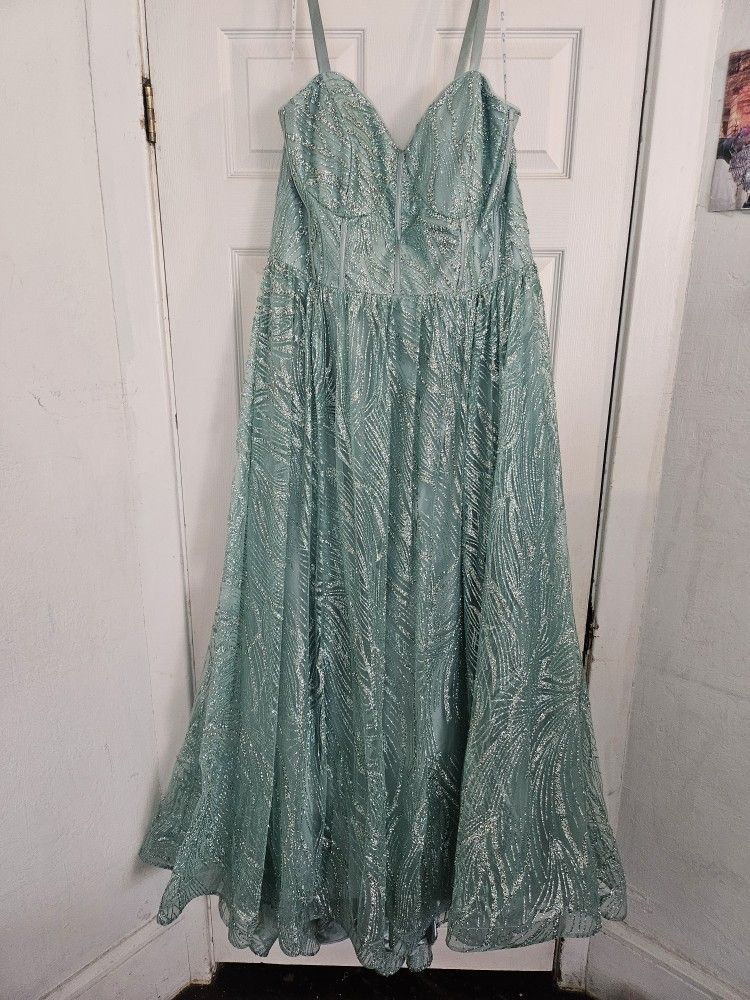 Sea green plus sized prom dress Only worn once. The straps are not adjustable we had to hand sew them to fit me (pictures of where it was stitched are attached) other than that there is no wear on the gown. Its a size 16w I payed $438 im asking for $200 or best offer