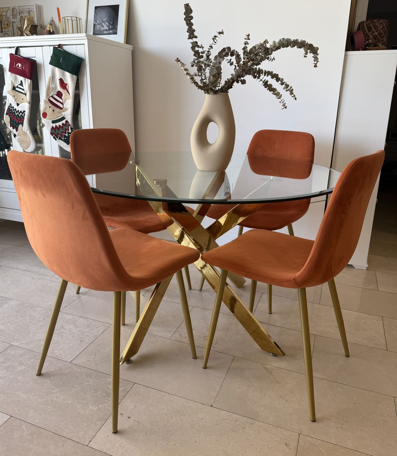 4 Gold Terra / Orange Velvet Dining Chairs – Modern – Great Condition