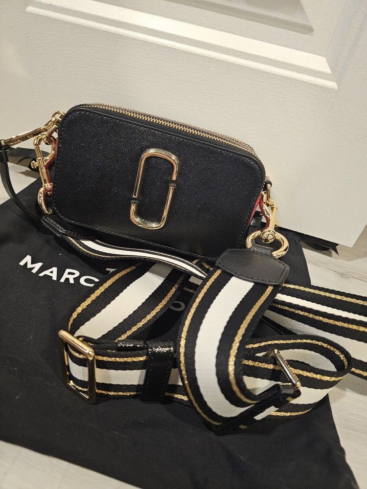 Stylish and versatile, this Marc Jacobs black crossbody bag is perfect for any occasion. Featuring a sleek design with gold accents, it adds a touch of elegance to your outfit. The adjustable strap ensures comfort and convenience
