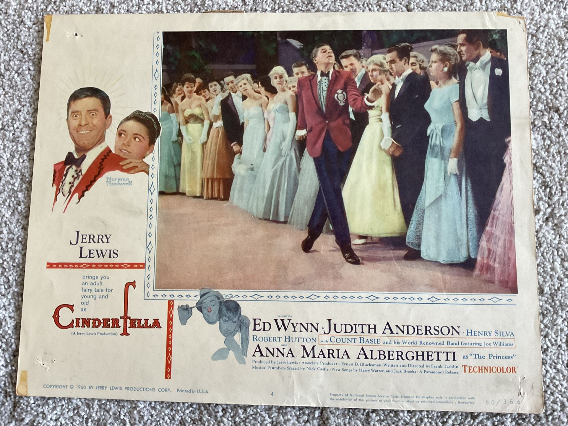 This is the complete set of 8 1960 Paramount Pictures Movie Lobby Cards measuring 11" x 14" for “Cinderfella”, the semi-musical comedy adaptation of the classic Cinderella story starring Jerry Lewis, Ed Wynn, Judith Anderson & Anna Maria Alberghetti. The condition of this full set of 8 midcentury lobby cards for the Jerry Lewis comedy “Cinderfella” is good with general wear & tear such as edge & corner wear & tear, tape marks in blank borders of cards #3 & #4, tape on back of several cards which does not impact front side, smudges & red marks or lines in card #6. See photos.