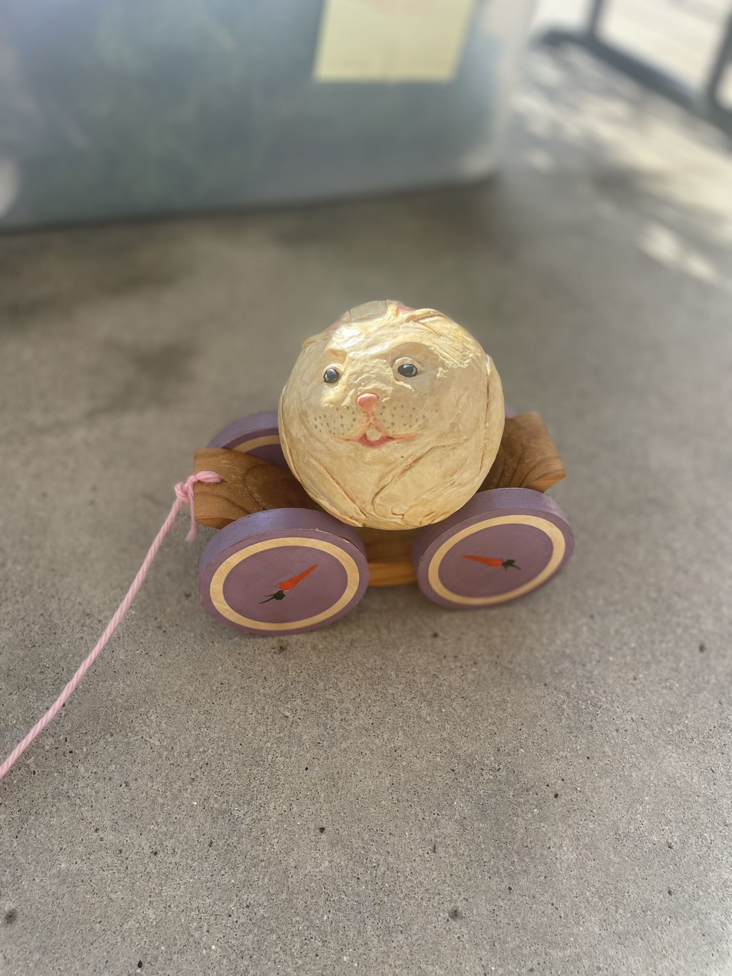 BRIERE DESIGN Folk Art Easter Bunny Rabbit Pull Toy Carrot on Each Wheel of Cradle / Cradle Ball Approximately 4" diameter Cradle Approximately 7" x 3" Cradle marked "(c) 1986 BRIERE" GOOD USED CONDITION