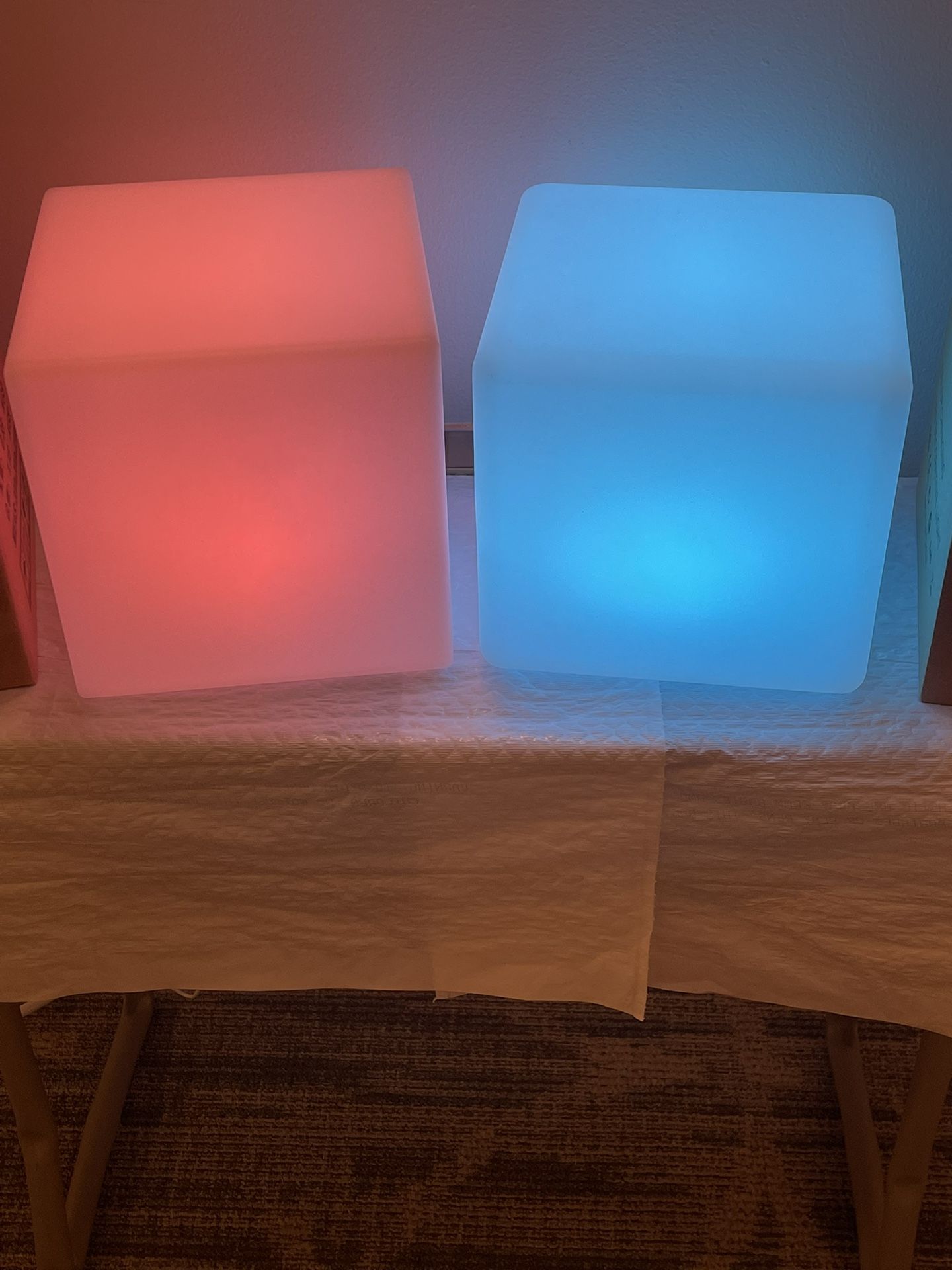 NEW!! Large, 8"Sq. LED Color-Changing CUBE. DIMENSIONS: 8" tall; 8" wide 16 different LED color options, 4 color-changing modes (flash, strobe, fade, & smooth). Includes remote that does not require batteries; recharges by plugging into outlet for 4-5 hours. Internal rechargeable lithium battery with 20-hour run-time. Two (2) Cubes available. PRICE: $40 EACH (firm); or $70 for BOTH Cubes purchased together (firm). CASH only. PICKUP only. Thank you!!