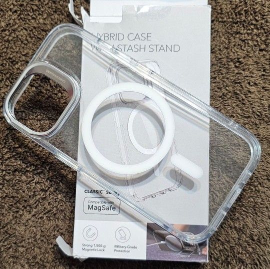 Clear magsafe case with kick stand intergrated for an iPhone 15 NEW open box item pictures from actual item ready for pick up or can meet halfway