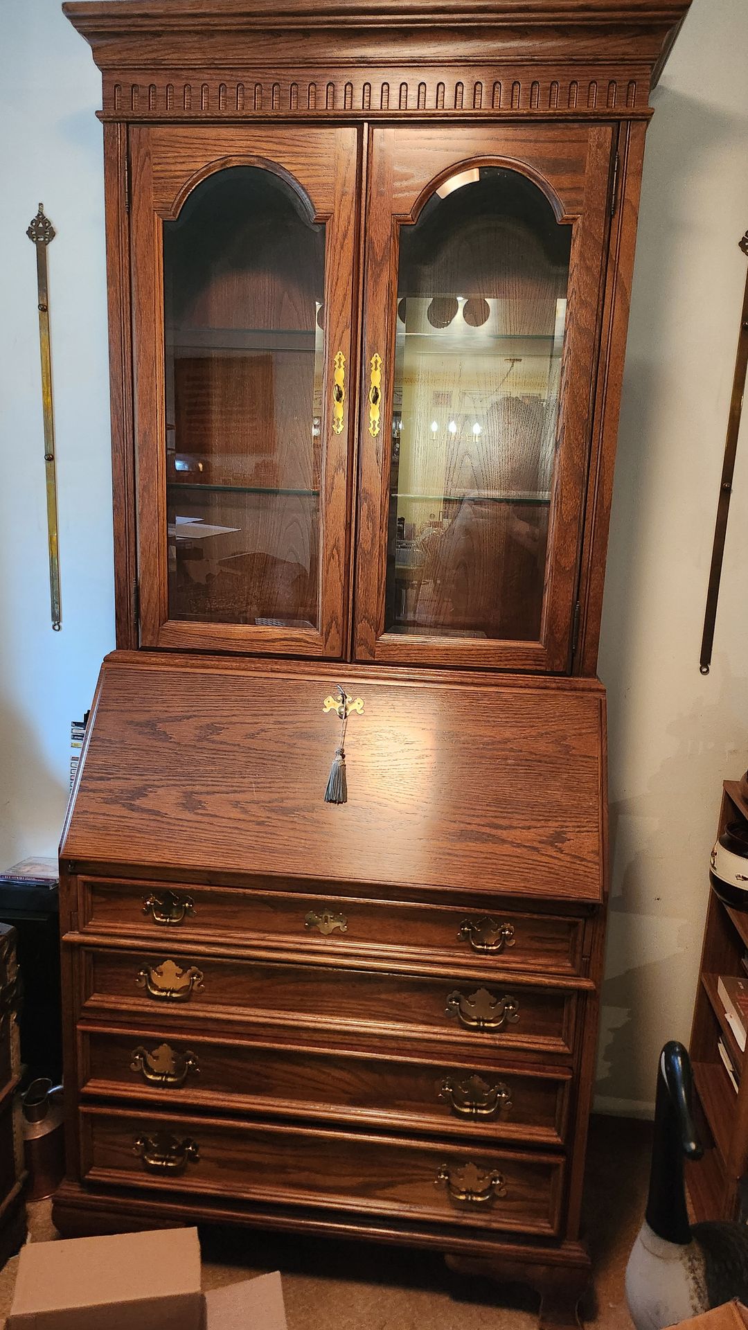 This oak secretary desk and hutch is a Pennsylvania House or Jasper Cabinet Co. model featuring a drop-front writing surface, brass hardware, and leaded glass doors.