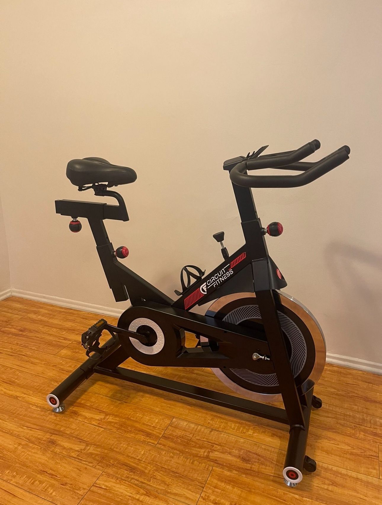 Well-maintained stationary exercise bike with adjustable resistance and height. Solid build with alloy steel frame. Smooth, quiet ride - perfect for home workouts or spinning routines. Condition: Good condition overall. Light wear and tear on the handle grips (see photos), purely cosmetic and doesn't affect functionality. • Dimensions: 43" L x 39.5" H x 20" W • Height Range: 109-213 cm • Weight: 84lbs Delivery available for an extra fee