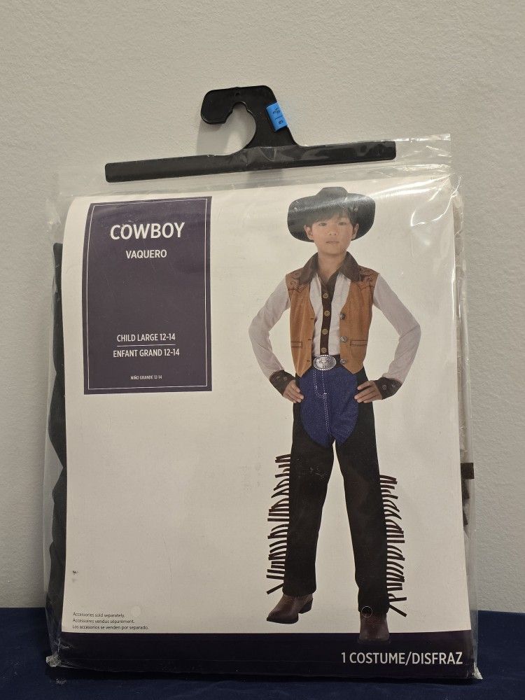 Brand new in package Childs Cowboy Dress Halloween up Costume. Includes a shirt with an attached vest and pants with attached chaps. The hat and boots are not included. Cowboy costume size child Large 12-14. Originally sold at Party City Pickup at Bronx 40 Precinct, 149st Price: $13, Cash, Venmo, zelle