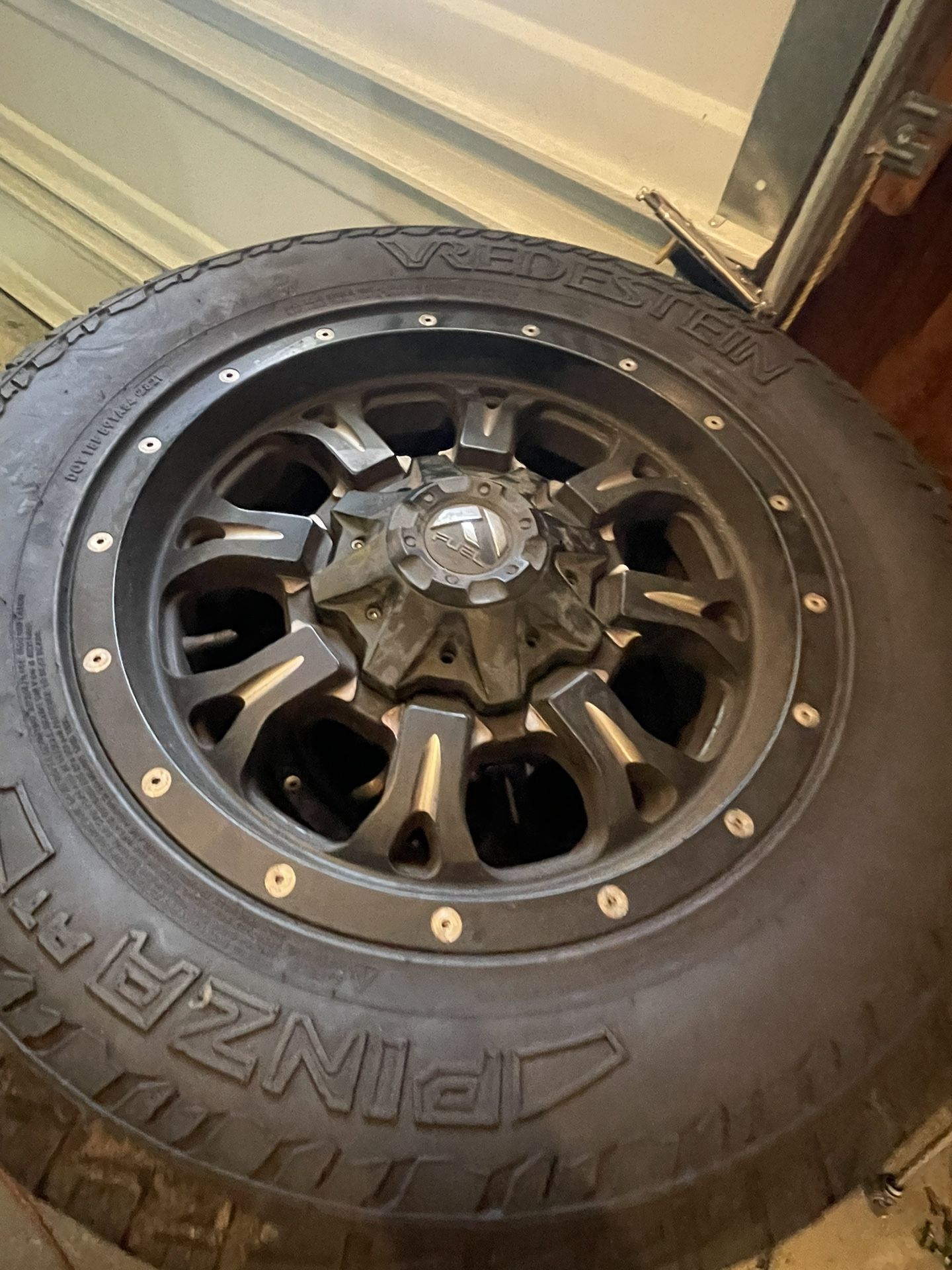 Fuel rims and tires from my 2020 ram 2500 bolt pattern is 8x6.5 Tires are 275/65/18 Tires are kinda worn but maybe 50% I spent a few grand on the rims years ago.