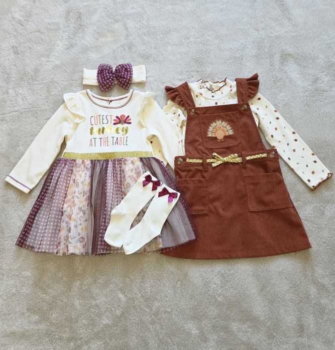 Baby starters tutu dress in size 24M and Little Lass overall outfit in size 2T, Thanksgiving bundle for Baby girls. Both excellent condition.