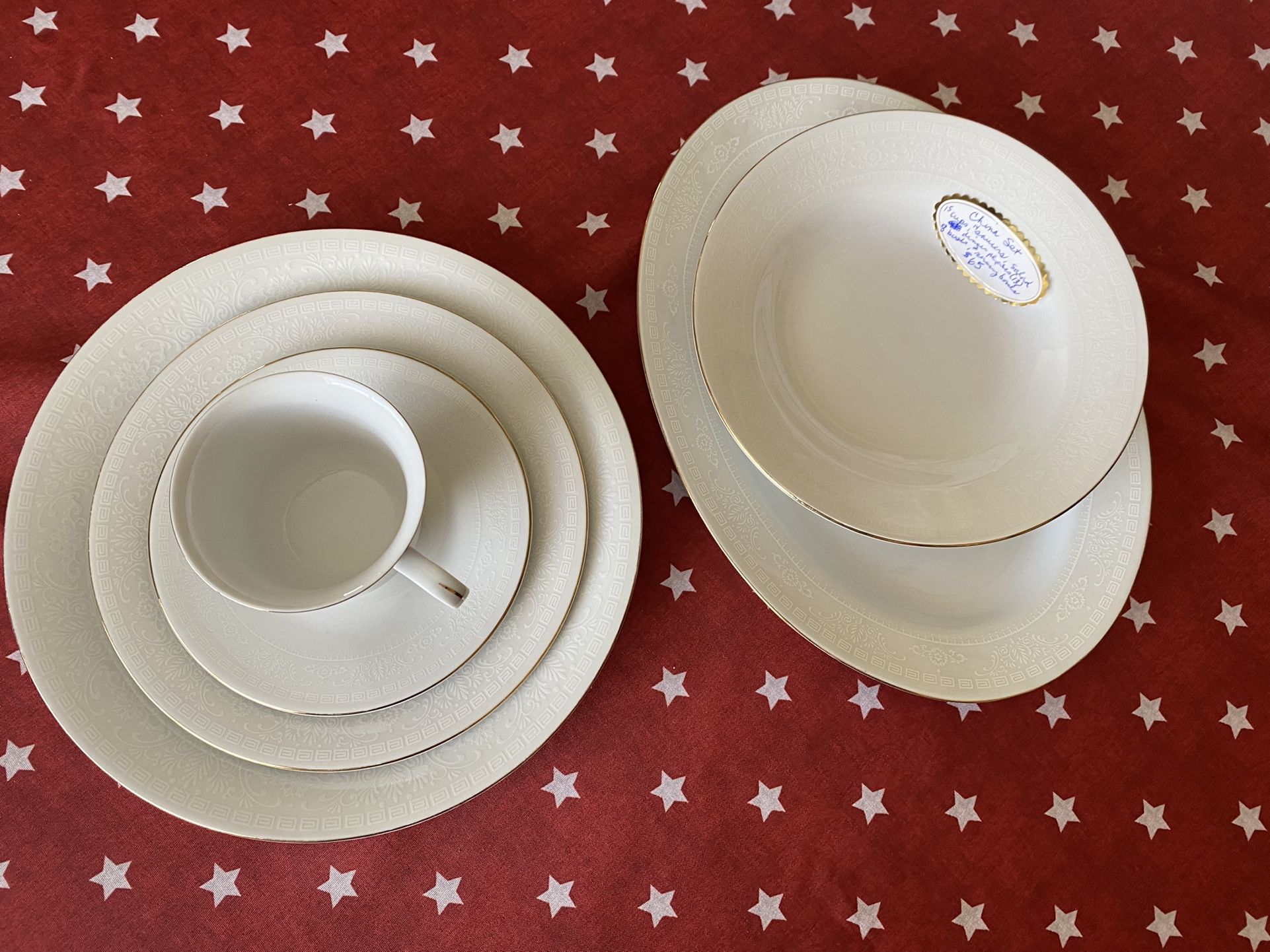 (15) cups, (14) saucers, (13) salad plates, (13) dinner plates, (8) bowls, & (2) serving plates 25$ for the entire set