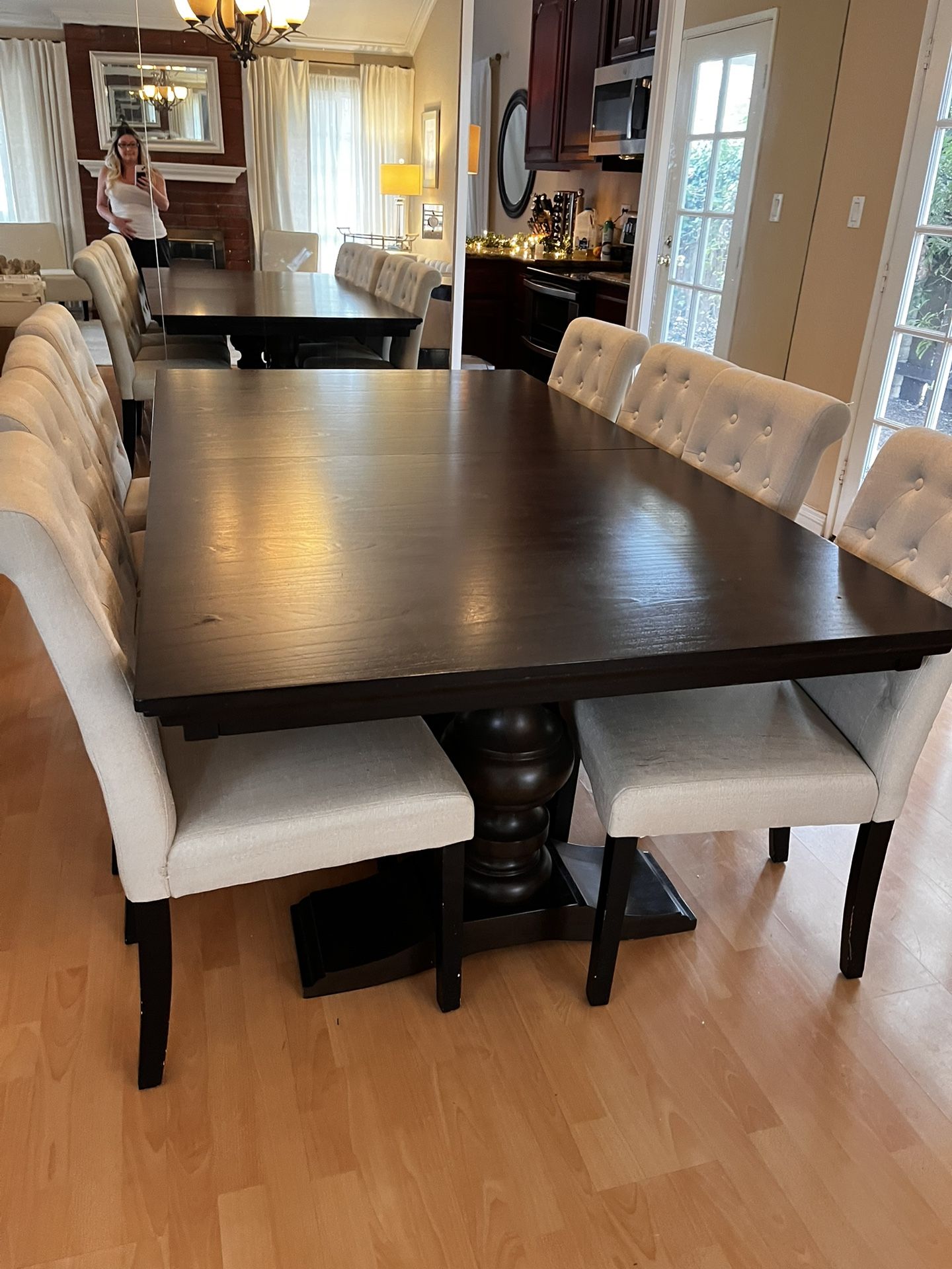 Selling a full dining room + living room furniture bundle — priced to sell fast due to moving. Includes EVERYTHING: • Dining room table with 8 chairs + 2 head chairs • Tufted couch • 2 tufted accent chairs • Console table (very heavy, solid, well made) • Side table • Living room coffee table • 2 mirrors • Bookcase All pieces are sturdy, heavy, and well made. Some items have light stains, reflected in the price. 👉 Selling as a bundle only (or priority given to bundle buyer). 👉 Great value for someone furnishing a home, rental, or staging. Pickup only. Serious buyers only. Message me for photos and bundle price.