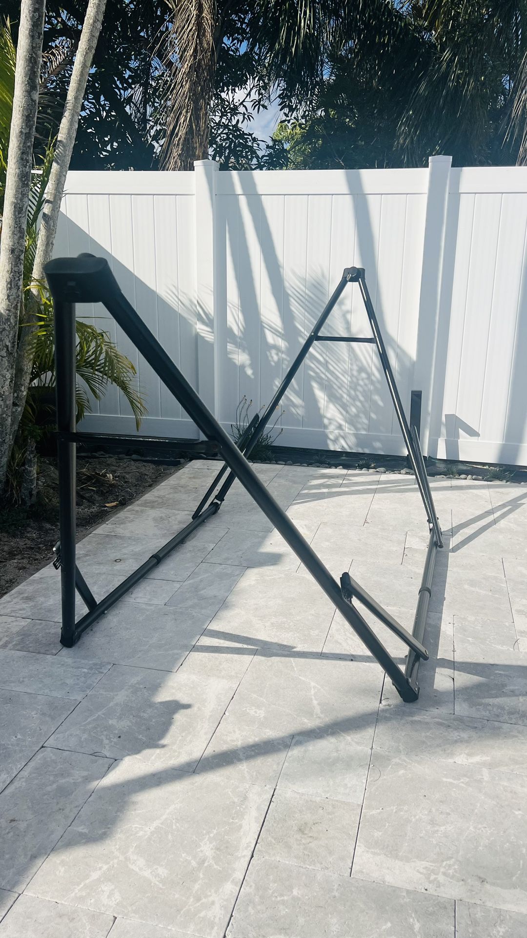 Hammock stand, top measures 111”-133” height 39”-43” you can adjust to the height and length you need. It folds to take anywhere.