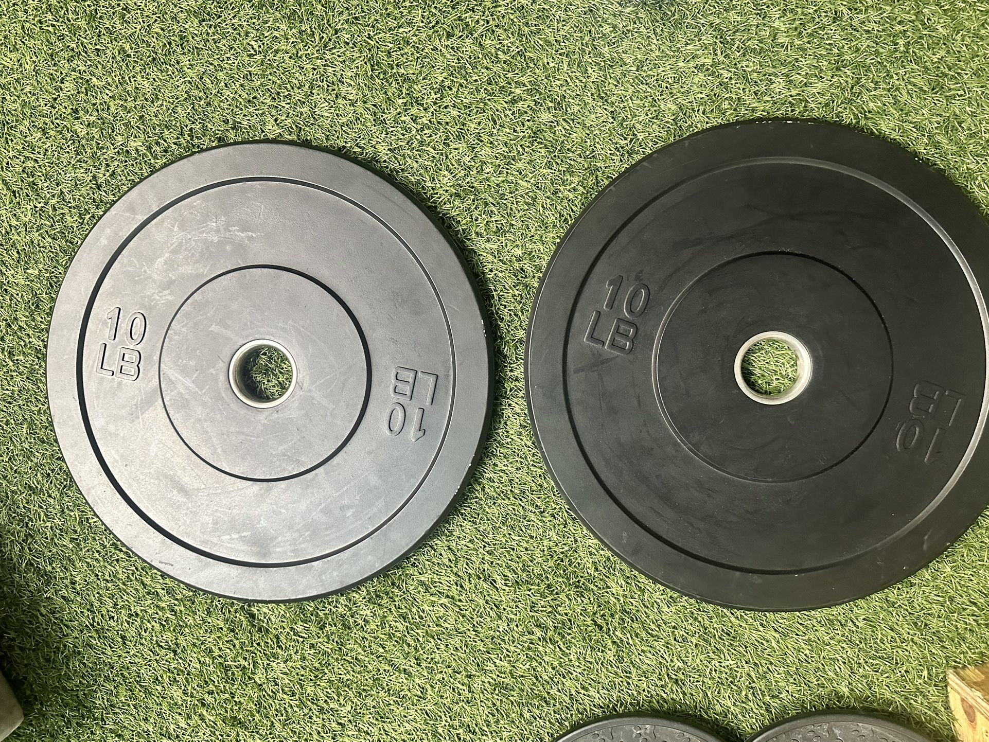 I have 2 sets of bumper plates X2 - 45lb plates. $90 X2 - 10lb plates. $30 Or Total together= $100 Fit on standard Olympic bar. Been kept inside their whole lifespan- a few scuffs on the rubber , but no big deal.