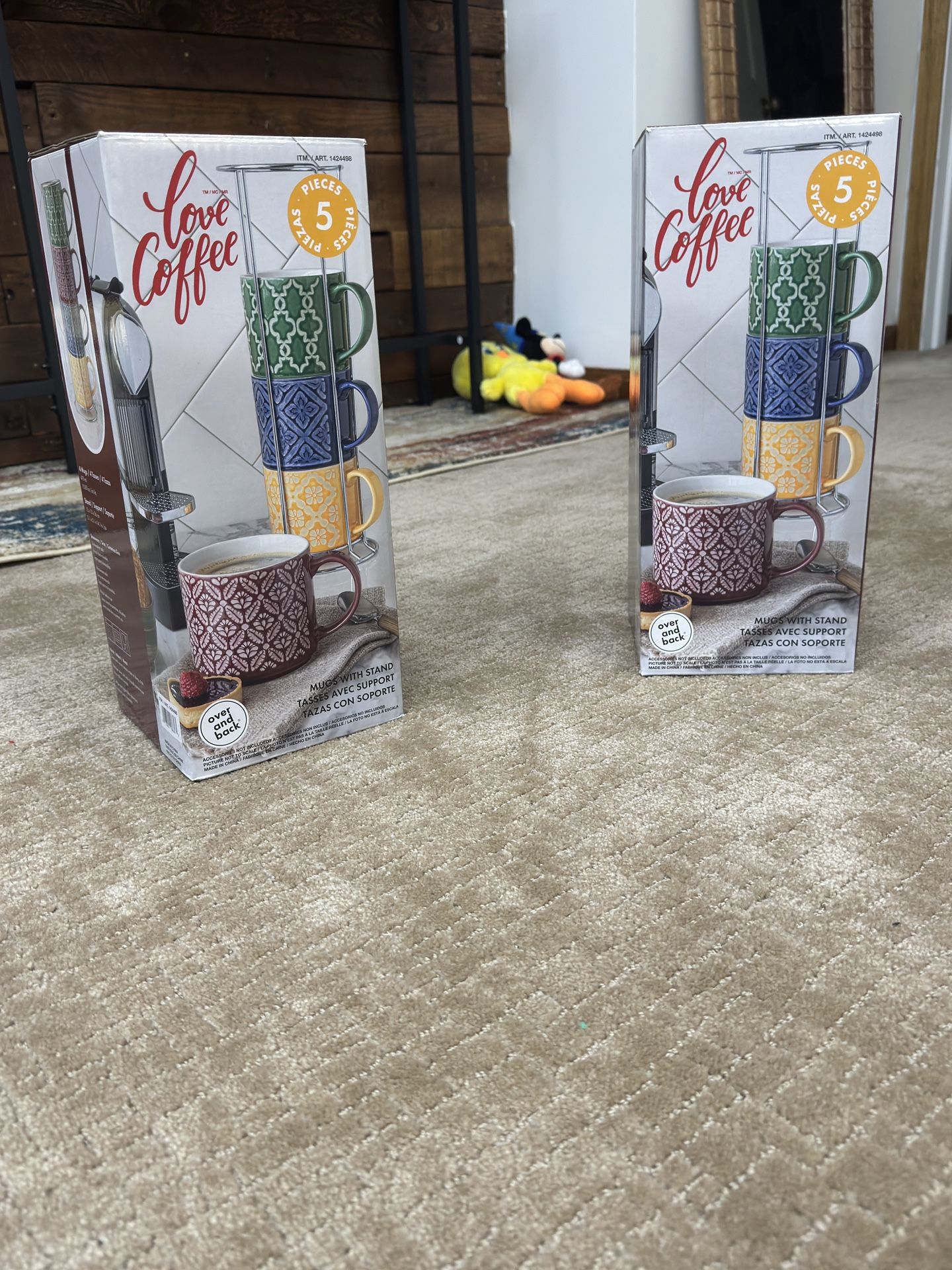 These are 2 brand new unopened coffee mugs with stands we have a promotion buy one get one free or you can buy it separately for $29.