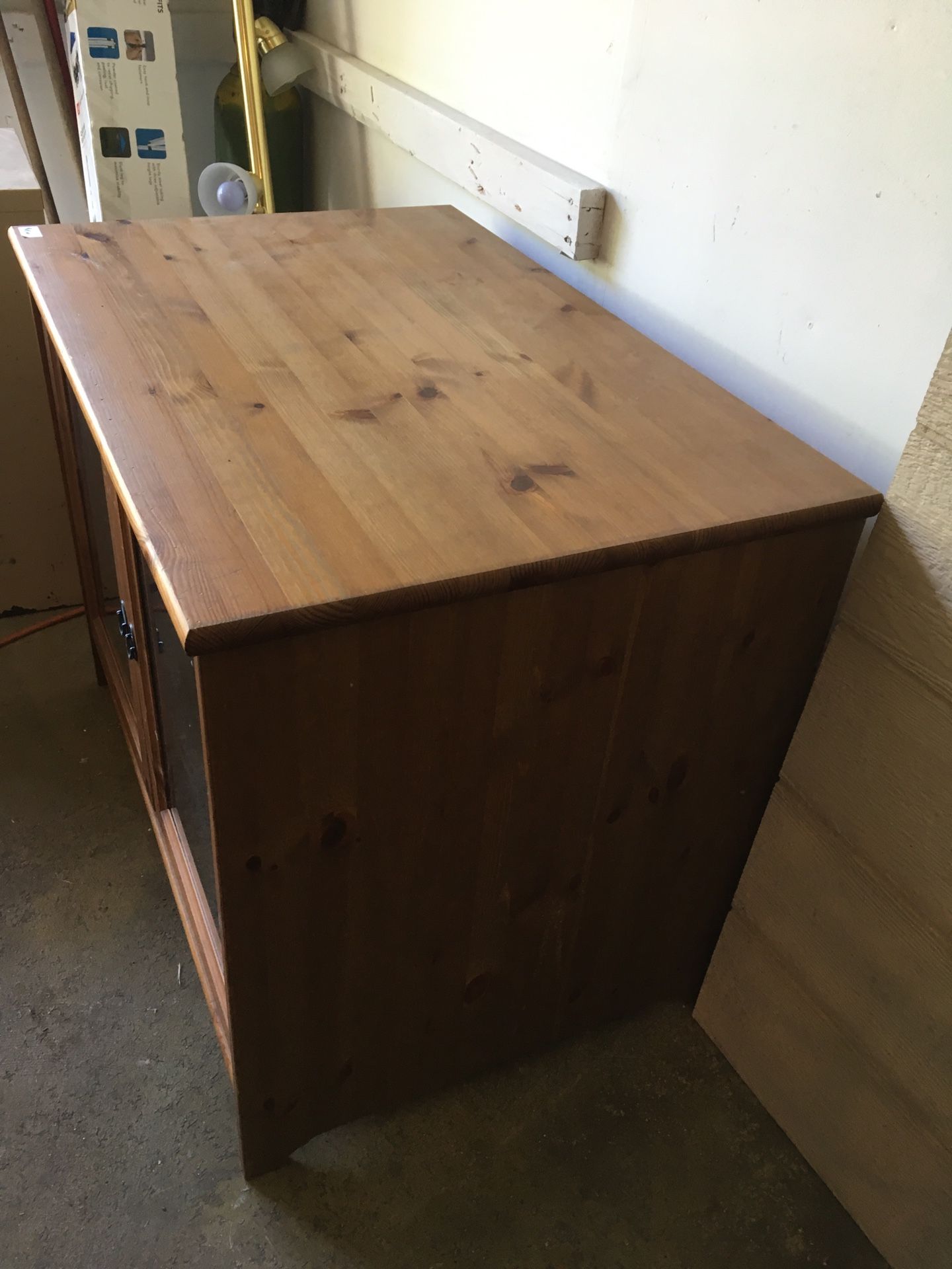Glass. Front cabinet with shelf 38” long, 29 1/2” tall, 24 1/2” wide